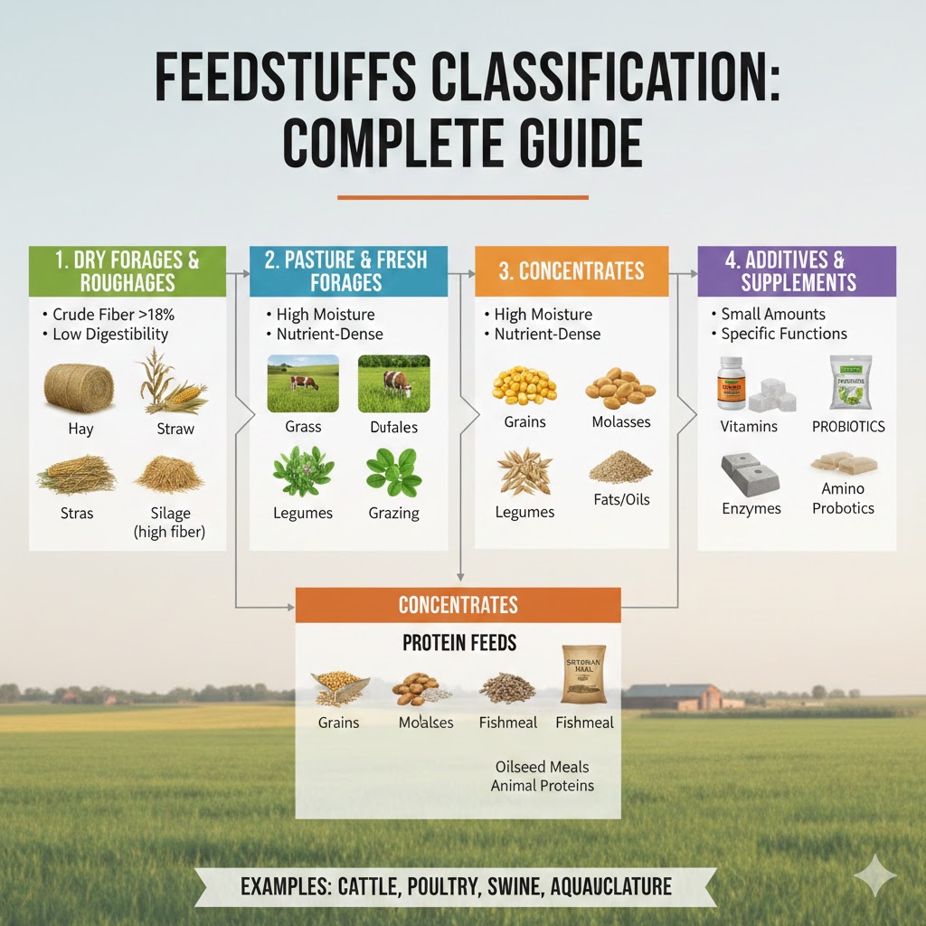 classification of feedstuffs complete guide with types and example is a topic in which we will study about the systematic grouping of animal feeds based on their nutrient composition, fiber content, origin, and physical characteristics.