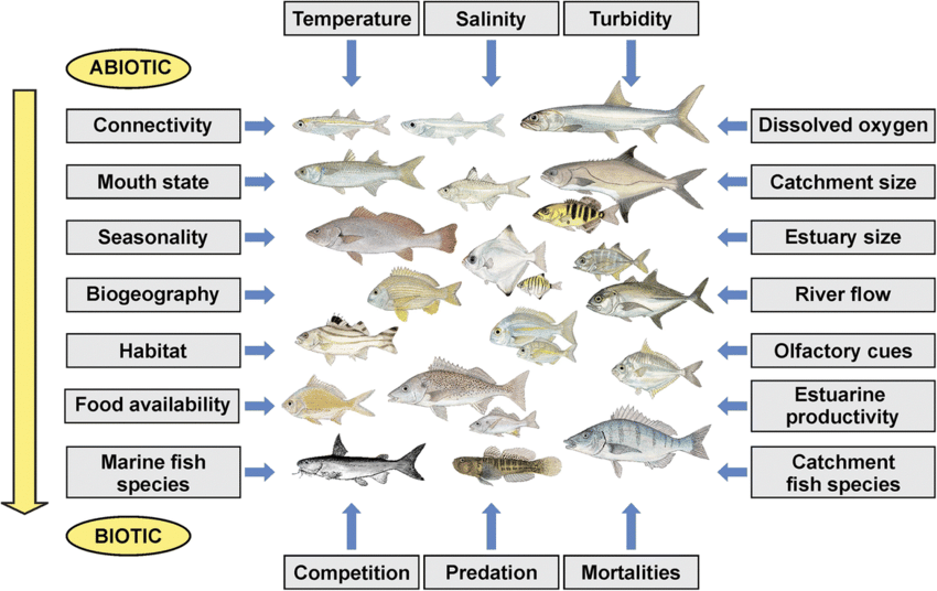 The environment consists of abiotic (non-living) and biotic (living) components. These components are interdependent, and together they shape fish ecology and population dynamics.